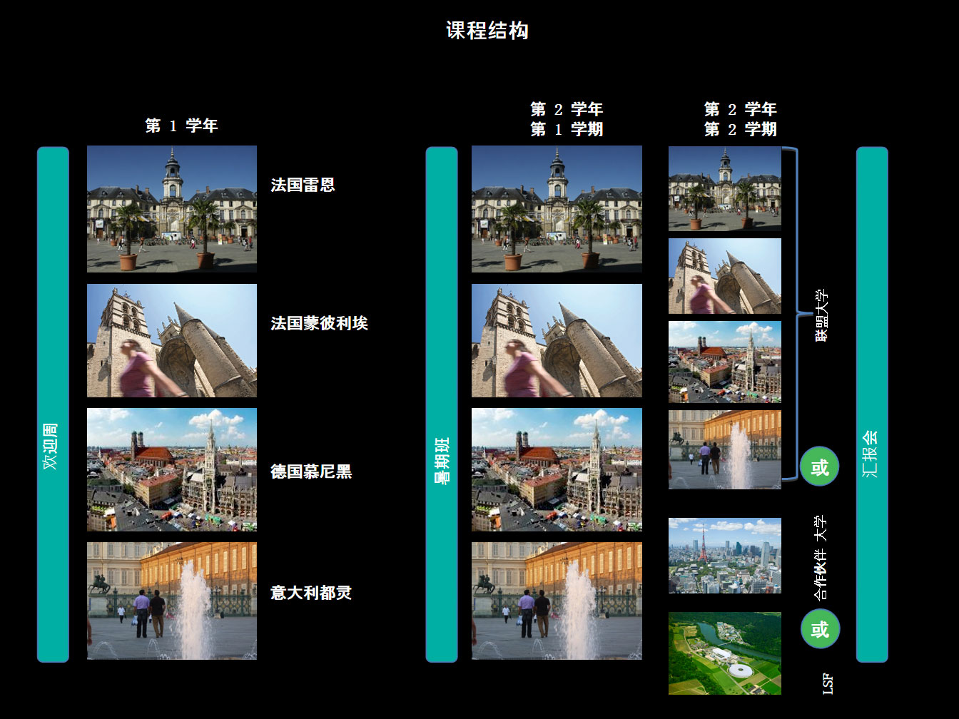 课程于每年九月开始,包括讲座、辅导、研讨会和以工作为主的研究项目。学生可从五所大学中选择其中一所学府,开始其一年级学习之旅。学生将在其他四所大学的其中一所接受第三学期的学习,而第四学期的学习可选择任一联盟大学、LSF 或任一合伙大学(美国、巴西、日本、俄罗斯、印度、瑞士)参与该行业的学习。学生需要在每个学期获得 30 ECTS 学分。